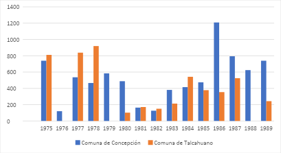Figura N° 5. Total, de Viviendas Terminadas en las Comunas de Concepción y Talcahuano por unidades construidas, entre los años 1975 a 1989.