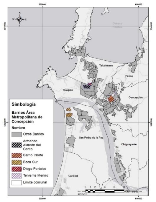 El análisis documental fue complementado con trabajos de campo para localizar viviendas que aún existen como resultado de los procesos de reconstrucción. Este proceso se apoyó en fuentes orales y archivos personales proporcionados por residentes de las áreas de interés. Además, se exploraron poblaciones y antiguos barrios en el Gran Concepción los que se ilustran en el mapa (Figura 1). La revisión de fuentes incorporó material gráfico y periodístico disponible en la Biblioteca Municipal de Concepción, la Biblioteca Central de la Universidad de Concepción, así como pequeñas bibliotecas comunitarias en Boca Sur, San Pedro de la Paz; y Barrio Norte en Concepción.