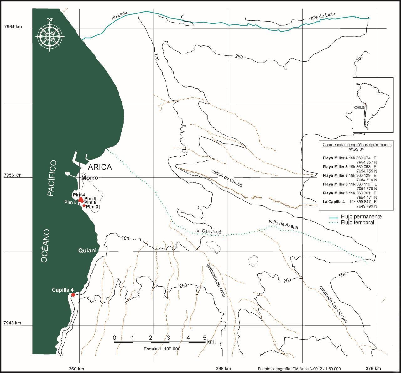 Figura 1. Localización de los sitios arqueológicos Playa Miller (PLM) y la Capilla, costa sur de Arica.