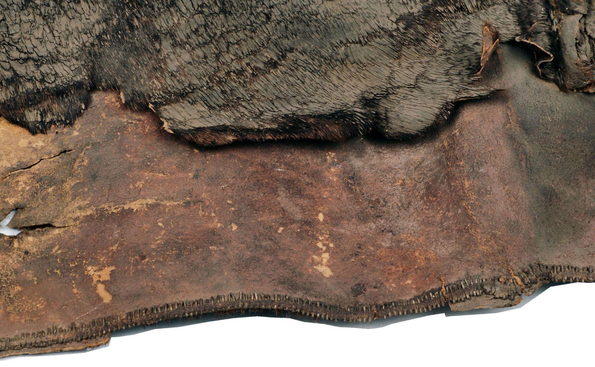 Figura 8. Fragmento de cuero de lobo marino, zurcido en un extremo. Cementerio PLM-6.
