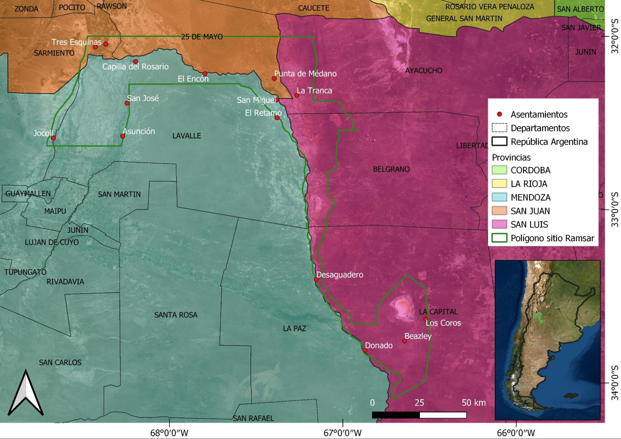 De acuerdo con Wetlands International LAC (2014) y el Ministerio de Ambiente y Desarrollo Sostenible (2022), dentro de los límites del sitio Ramsar viven aproximadamente 2 000 personas. Blanc [s/f] establece un máximo de 4 000 habitantes repartidos principalmente entre 12 comunidades. Buena parte de esta población es descendiente del pueblo Huarpe, que habitó la zona de humedales, bañados y lagunas siglos atrás. La ubicación de los asentamientos actuales está atada a su historia remota y reciente, por lo que sus ubicaciones proporcionan indicios indirectos acerca de los recursos hídricos y la conectividad terrestre (Figura 1).