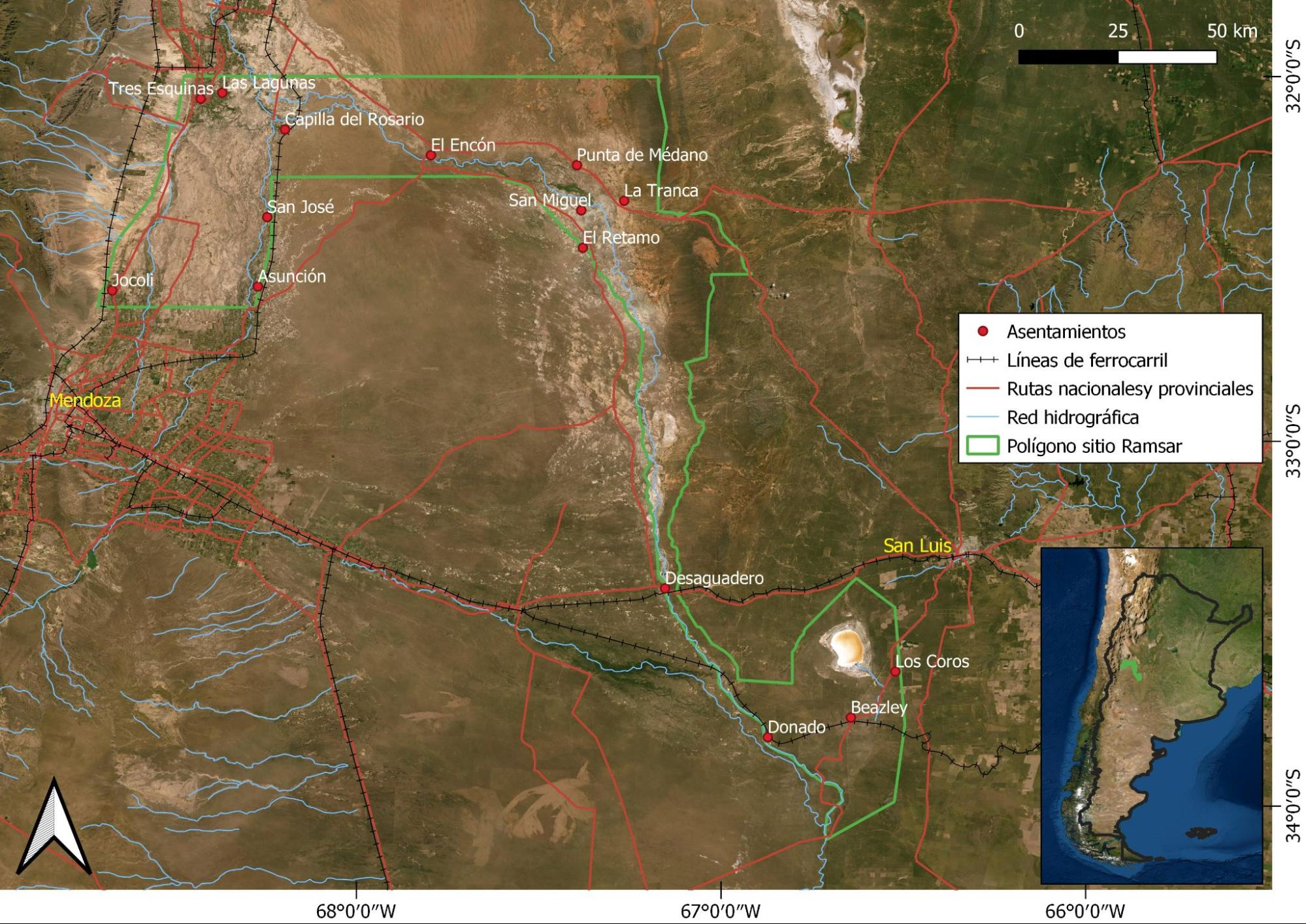 Con el establecimiento del sitio Ramsar Lagunas de Guanacache, Desaguadero y del Bebedero (Figura 1), los antiguos humedales cuyanos del centro-occidente argentino se protegieron legalmente (bajo amparo de la Ley argentina N.º 23919), con fecha de designación del 14 de diciembre de 1999. Este sitio cuenta actualmente con 9 623,70 km2 y abarca una zona tectónica deprimida, rellena de antiguos sedimentos provenientes de las escorrentías de los ríos San Juan, Mendoza y Tunuyán (Ramsar, 2007).