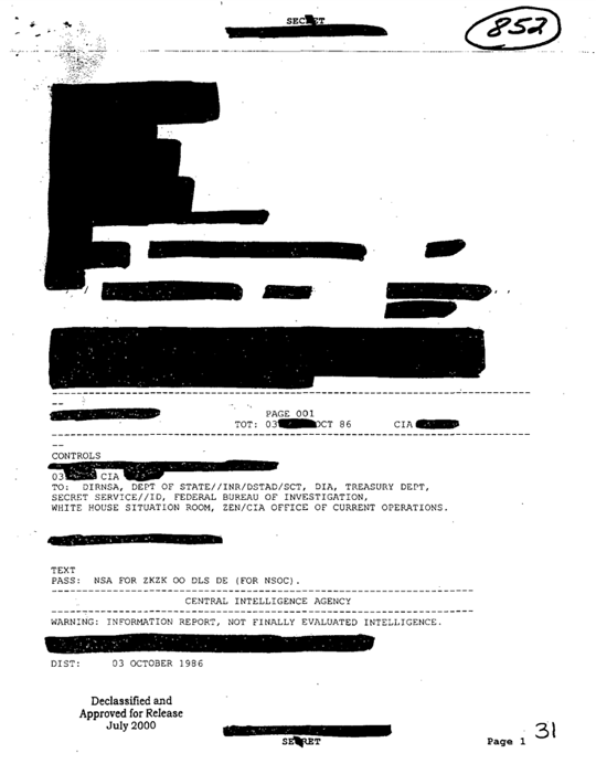Se aprecian los códigos de eliminación NR y B1, los que podemos leer gracias a la página web de códigos de redacción del NARA.[67] NR significa Not Responsive: si el documento habla de una situación que no tenga que ver con Chile, queda fuera de los objetivos del proyecto, por lo que no se desclasifica. B1 es de los códigos más recurrentes de clasificación dónde se utiliza para proteger la identidad de una fuente humana confidencial, fuente de inteligencia humana, relación con un servicio de inteligencia o seguridad de un gobierno extranjero u organización internacional, así como la protección de una fuente de inteligencia no humana. También permanece clasificada información que pudiese perjudicar la eficacia de un método de inteligencia actualmente en uso, disponible para su uso o en desarrollo.