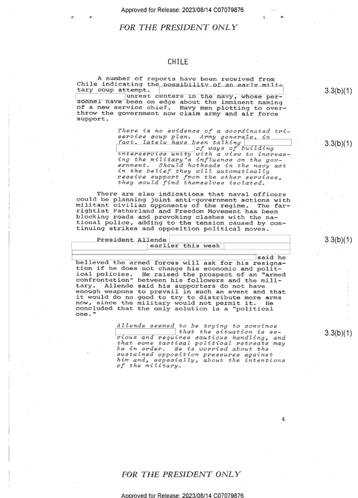En este caso se trataba de resúmenes diarios enviados al presidente estadounidense. El primero da cuenta de las posibilidades de un golpe militar en base a información entregada desde Chile acerca de movimientos de miembros de la Marina, y el segundo corresponde al mismo día del golpe donde se informa que al movimiento de la Marina se había integrado el apoyo de otras unidades claves de las FF.AA. chilenas, pero manifestando la duda de si tendrían el suficiente apoyo de la oposición civil al gobierno de Salvador Allende.