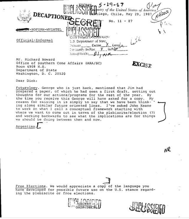 El documento anterior es llamado un oficial-informal (Fig 7.). Este tipo de documento consiste en una carta escrita desde un puesto en el extranjero dirigida al Departamento de Estado, enviada fuera de los canales ordinarios de comunicación (despachos, telegramas y aerogramas), manteniendo su característica oficial. La informalidad radicaría en la conducción alternativa y la consideración de que sería información que posteriormente sería entregada formalmente, pero que va en modo preliminar.[65] Si vamos al timbre del Chile Project, podemos apreciar una selección manuscrita a Excise que significa que, por materias de seguridad nacional y, de acuerdo con las normas de excusión de la Executive Order 12.958[66] que regía en ese entonces.
