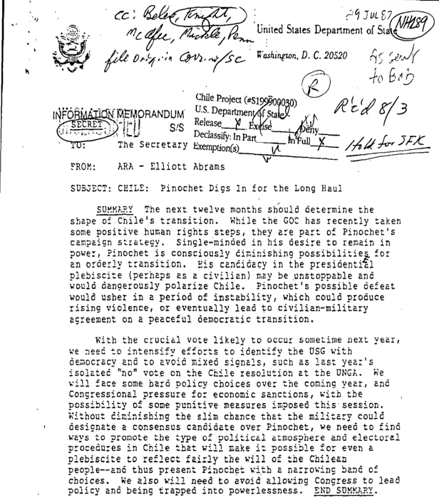 Por otro lado, tenemos un ejemplo de documento completamente desclasificado (Fig 6). Es un Information Memorándum[64] enviado por Elliot Abrams, Subsecretario de Estado para Asuntos Interamericanos al Secretario del Departamento de Estado George Schultz. Se puede identificar el timbre del Chile Project con su código de caso (#s199900030), con las indicaciones manuscritas de aprobación para su publicación, desclasificado en su totalidad y sin exenciones. Otra porción manuscrita incluye a las personas a las que se le envió el memorándum, junto con instrucciones de retención. Este tipo de documento es muy valioso para esta investigación. Abrams realiza un análisis minucioso de la situación chilena y las proyecciones futuras de la dictadura militar, sugiriendo que amplifiquen esfuerzos para que Estados Unidos sea asociado con la democracia -concepto que está en permanente tensión en la coyuntura y esta tesis. Es importante a la vez considerar que los altos mandos tienen un ejército burocrático de investigadores y redactores, pero, si algo sabemos con seguridad es que, si aparece su nombre, es información aprobada y de la cual se hace responsable.