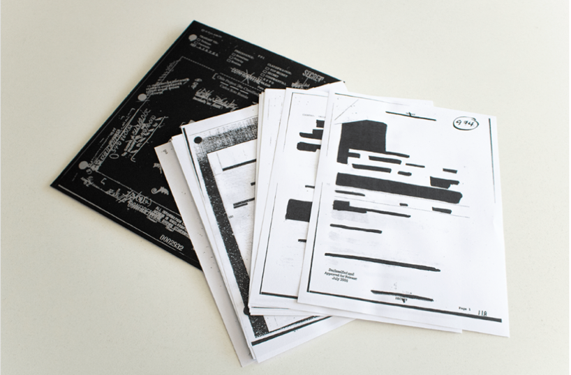 Estos silencios no han pasado desapercibidos. La estética de la censura en el acto burocrático de desclasificar ha inspirado diversas exploraciones artísticas, como la obra de la artista chilena Voluspa Jarpa y sus trabajos con documentos desclasificados, lo que incluso la llevó a la Bienal de Arte de Venecia, el año 2019, representando a Chile con su obra “Altered Views”.[55] Desde el 2005 ha trabajado en sus obras la “capacidad de la pintura contemporánea para referirse a los hechos históricos que nos afectan en la cotidianeidad” (Fig. 1 y 2). [56] Otro ejemplo es el del poeta Carlos Soto Román, que ha explorado la visualidad de los silencios como propuesta visual en su publicación Chile Project, que consiste en un sobre negro con hojas sueltas que muestran reproducciones intervenidas con borrones y tachaduras de documentos desclasificados en el año 2000, exacerbando la censura para manifestar lo que considera evidente y absurdo en los silencios burocráticos (Fig 3.).[57]